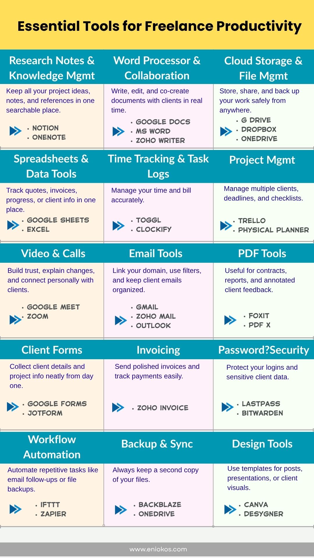 I hope that you will get a fair idea about the tools that you could use to improve your freelance productivity. Below is an infographic that you can download for easy reference.